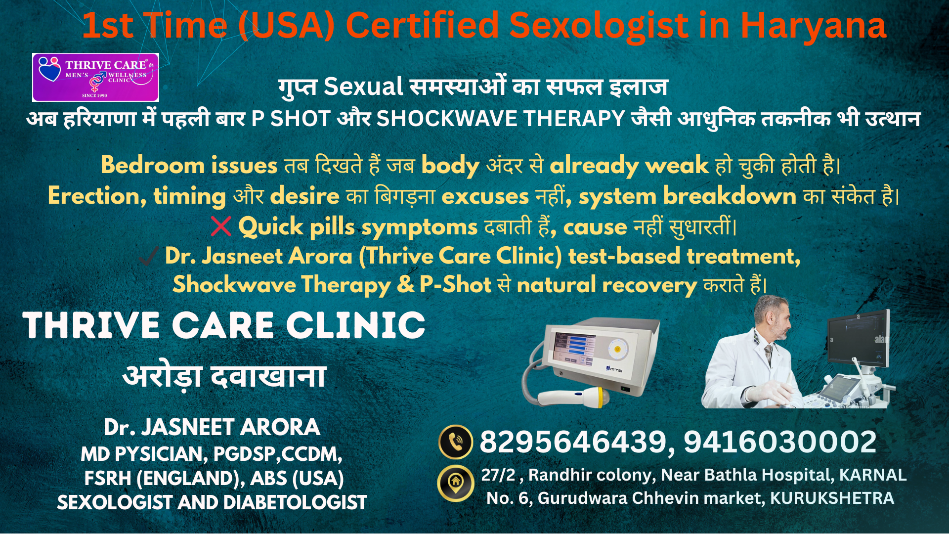 Yeh sirf bedroom ka issue nahi hota — jab ED, PME aur low desire saath aate hain, toh aadmi andar se tootne lagta hai. Confidence girta hai, relationship pe asar padta hai, aur guilt silent ho jaata hai. Dr. Jasneet Arora – Thrive Care Clinic mein problem ko judge nahi, samjha jaata hai. Test-based diagnosis, advanced therapies aur step-by-step recovery plan se body aur mind dono ko wapas control milta hai. Temporary nahi, real healing. #EDRecovery #PMEHelp #LowDesire #MensHealthIndia #ThriveCareClinic #DrJasneetArora #SexualWellness #ConfidenceBack #thrivecare #drjasneetarora #sexologistinkarnal #sexologistinkaithal #sexologistinkurukshetra #sexologistinpanipat #sexologist #stdtreatment #sexologistnearme #erectiledysfunctiontreatment #prematureejaculationtreatment #bestsexologist #sexualhealthclinic #guptrogdoctor #thrivecareclinic #thrivecareclinickarnal #bestsexologistinindia #sexualhealthclinic #sexologistnearmen #erectiledysfunctiontherapy #prematureejaculation #bestsexologistinkarnal #bestsexologistinkaithal #bestsexologistinkurukshetra #bestsexologistinpanipat #bestsexologistinambala #sexologistinchandigarh #aroradawakhana #Pshot #shockwave
