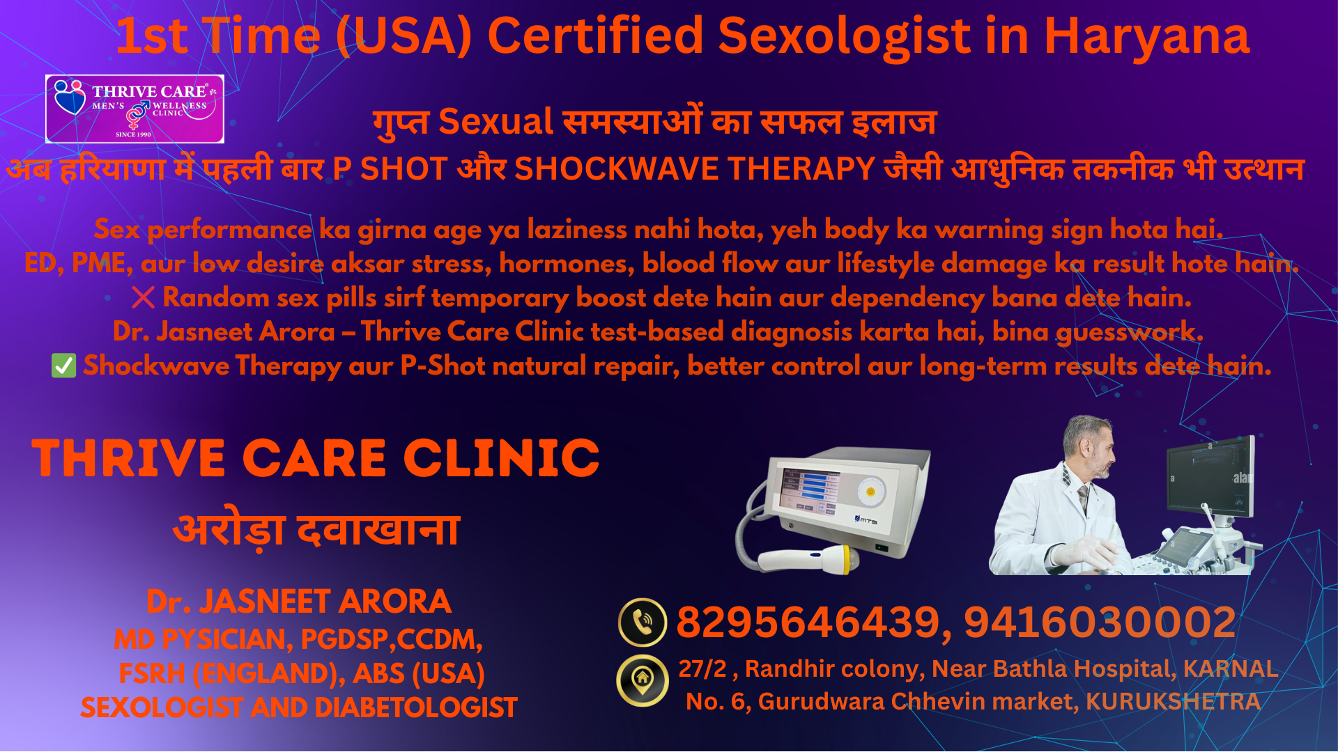Sexologist in Kaithal Thrive Care Arora Dawakhana Aaj kal stress aur anxiety ka direct impact sexual life par padta hai—ED, low desire aur PME jaise issues common ho rahe hain. Dr. Jasneet Arora at Thrive Care Clinic pehle root cause samajhte hain—sirf symptoms nahi. Proper counselling, stress management techniques, hormone aur blood flow evaluation ke through personalized treatment diya jata hai. Yahan random medicines nahi, balki long-term solution par focus hota hai, jisse confidence aur performance dono improve hote hain. Sahi time par help lena game changer ho sakta hai. #StressRelief #SexualHealth #EDTreatment #PME #LowLibido #MensHealth #ThriveCareClinic #DrJasneetArora #MentalHealthMatters #thrivecare #drjasneetarora #sexologistinkarnal #sexologistinkaithal #sexologistinkurukshetra #sexologistinpanipat #sexologist #stdtreatment #sexologistnearme #erectiledysfunctiontreatment #prematureejaculationtreatment #bestsexologist #sexualhealthclinic #guptrogdoctor #thrivecareclinic #thrivecareclinickarnal #bestsexologistinindia #sexualhealthclinic #sexologistnearmen #erectiledysfunctiontherapy #prematureejaculation #bestsexologistinkarnal #bestsexologistinkaithal #bestsexologistinkurukshetra #bestsexologistinpanipat #bestsexologistinambala #sexologistinchandigarh #aroradawakhana #Pshot #shockwave