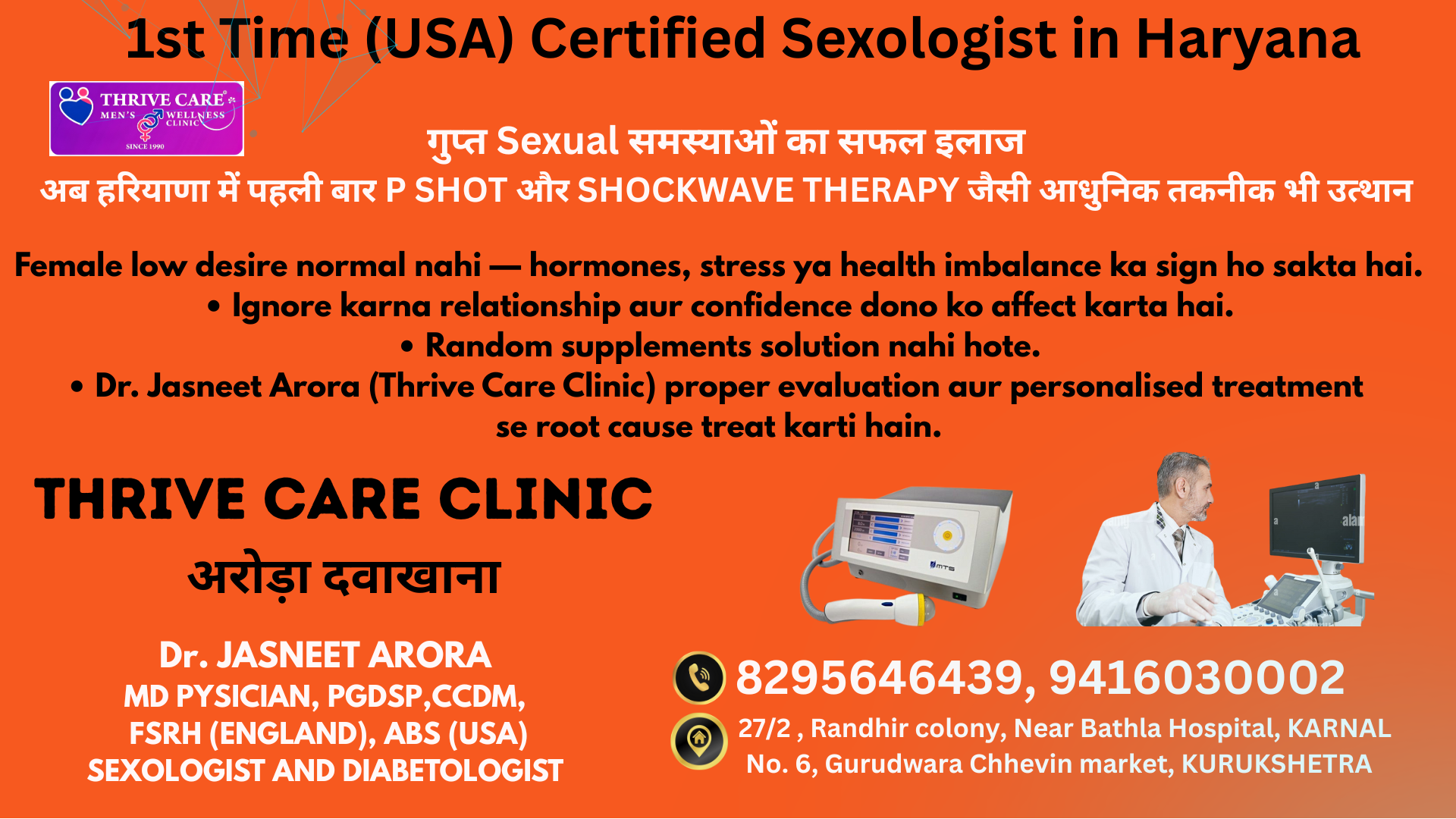 Sexologist near me Thrive Care Arora Dawakhana ED, PME और लो सेक्सुअल डिज़ायर सिर्फ शरीर की समस्या नहीं होते, ये इंसान के आत्मविश्वास और रिश्ते दोनों को अंदर से तोड़ सकते हैं। कई लोग शर्म या डर की वजह से चुप रहते हैं, जिससे तनाव, दूरी और मानसिक दबाव बढ़ता जाता है। Dr. Jasneet Arora at Thrive Care Clinic सही जांच, काउंसलिंग और एडवांस ट्रीटमेंट के जरिए समस्या की जड़ तक पहुँचकर इलाज करते हैं। सही इलाज से सिर्फ परफॉर्मेंस ही नहीं, बल्कि आत्मविश्वास, नजदीकियां और रिश्तों की खुशी भी वापस आ सकती है। #EDTreatment #PME #LowDesire #SexualHealth #MensHealth #CoupleRelationship #DrJasneetArora #ThriveCareClinic #thrivecare #drjasneetarora #sexologistinkarnal #sexologistinkaithal #sexologistinkurukshetra #sexologistinpanipat #sexologist #stdtreatment #sexologistnearme #erectiledysfunctiontreatment #prematureejaculationtreatment #bestsexologist #sexualhealthclinic #guptrogdoctor #thrivecareclinic #thrivecareclinickarnal #bestsexologistinindia #sexualhealthclinic #sexologistnearmen #erectiledysfunctiontherapy #prematureejaculation #bestsexologistinkarnal #bestsexologistinkaithal #bestsexologistinkurukshetra #bestsexologistinpanipat #bestsexologistinambala #sexologistinchandigarh #aroradawakhana #Pshot #shockwave